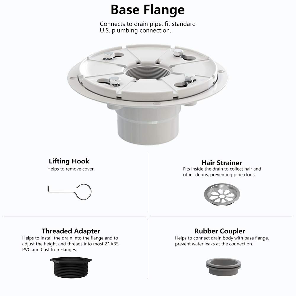 Shower drain 4 1/2 inch with shower drain base flange, shower drain with removable square panel, bathroom home hotel toilet, removable flat cover.